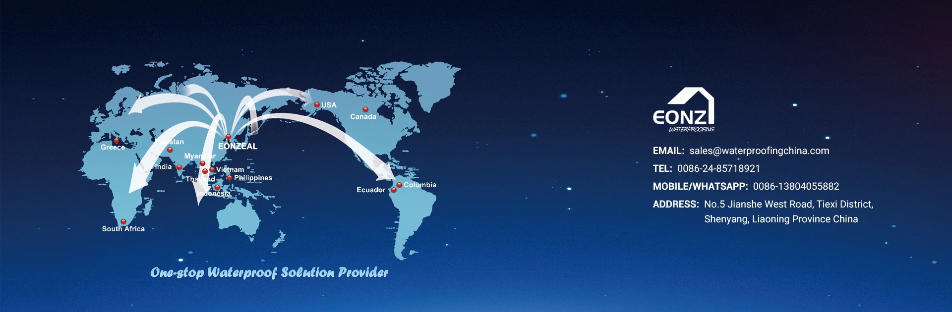 تأسست في عام 2006 ، تم تخصيص EONZEAL للماء في مجال العزل المائي للبناء ، مع أكثر من 20 عامًا من الخبرة في تصدير مواد العزل المائي ، تم تصدير منتجات Eonzeal إلى أكثر من 30 دولة مثل كندا وجنوب إفريقيا وباكستان والهند وماليزيا وإندونيسيا ، فيتنام ، ميانمار ، الفلبين ، تشيلي ، الولايات المتحدة الأمريكية ، الإكوادور ، بيرو ، بولندا ، اليونان إلخ.